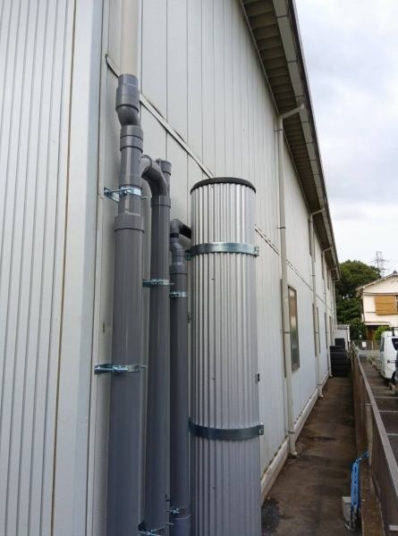 今回の施工では、雨樋から初期雨水分離槽を経由し、