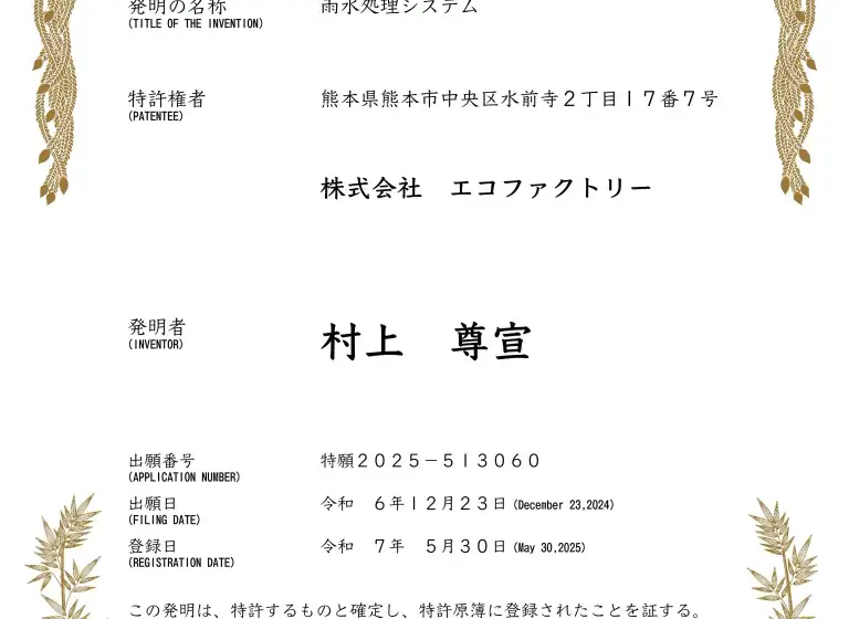 ecowinWATER「雨水処理システム」が日本特許を取得しました!