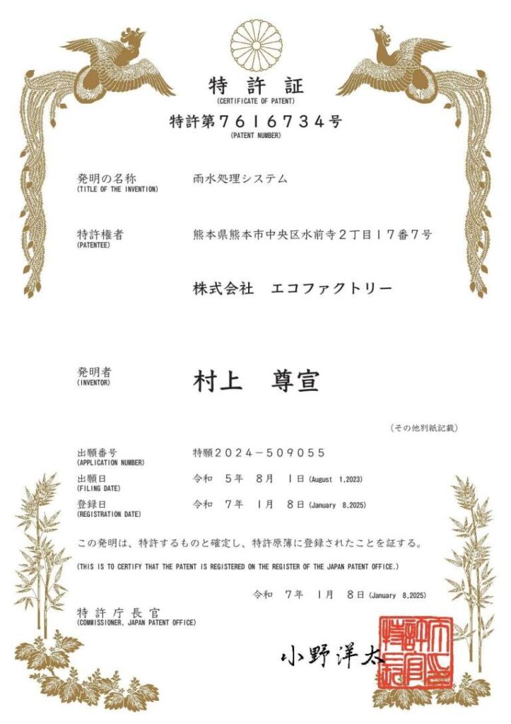 この特許は、雨水を安全かつ効率的に再利用する独自技術が公的に認められたものであり、