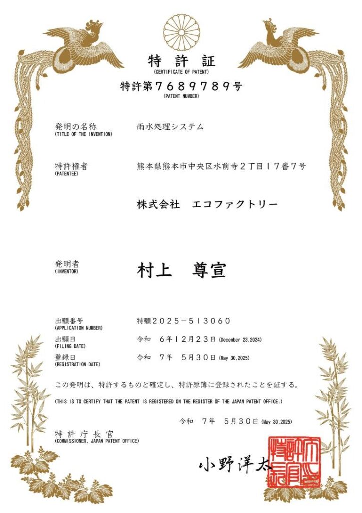 この特許取得は、ecowin WATERが有する無動力雨水浄化技術の独自性と社会的有用性が、公的に認められた証です。