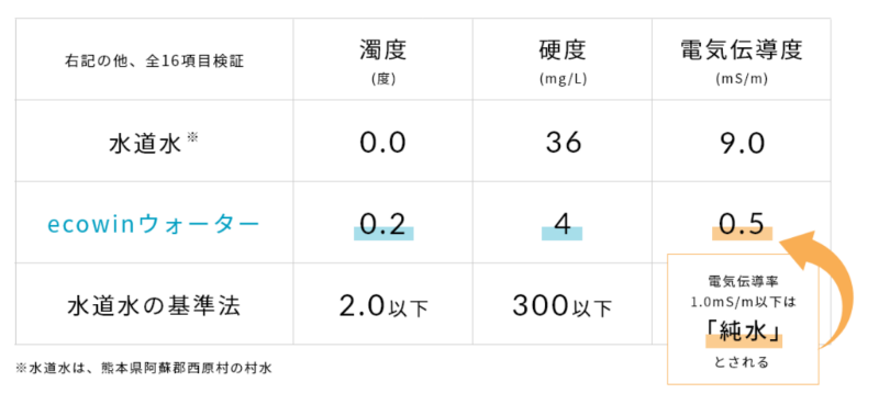 ecowin ウォーターと水道水の水質分析評価の比較では、水道法に基づく各種項目の水質基準値を下回り、水道水よりも鉱物イオンなどの不純物が少ない「キレイな水」であることが検知されました。非常時には飲料水の水源としても利用ができます。