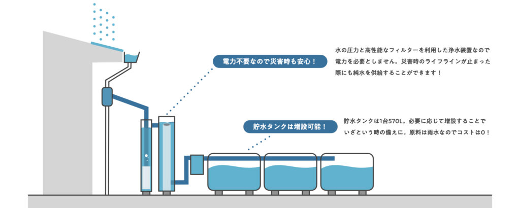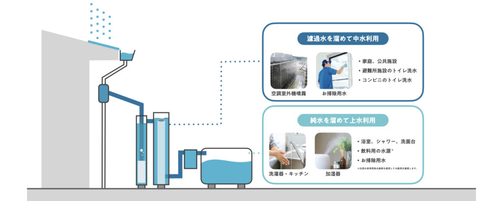 ecowin WATERは、無動力の雨水処理システムとして、屋根から降りる雨水をろ過し純水として再利用できます。その仕組みにより、水道水への依存を大きく軽減し、年間を通じて安定的に節水効果を実現。公共料金の低減に貢献すると同時に、環境負荷の低い暮らしをサポートします。