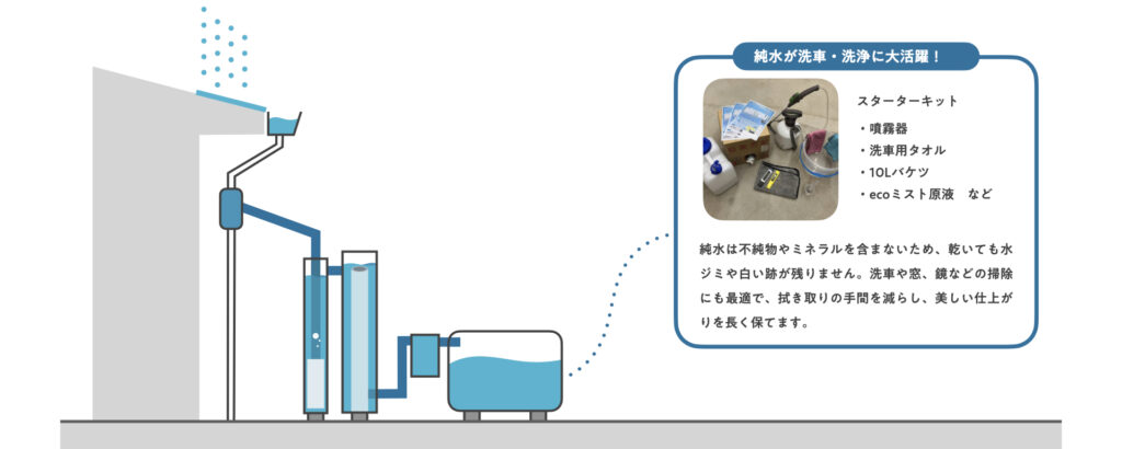 ろ過された純水は、むしろしなやかに洗剤の代替としても機能します。低イオン性により、機器や素材を傷めずに汚れを浮かせて除去。ガラスや鏡は拭き跡が残らず、洗車は洗剤要らずで環境に配慮した仕上がりになります。洗浄力と安全性を兼ね備えたこの純水は、工場や医療・介護施設、ホテルなどプロユースにも最適です。